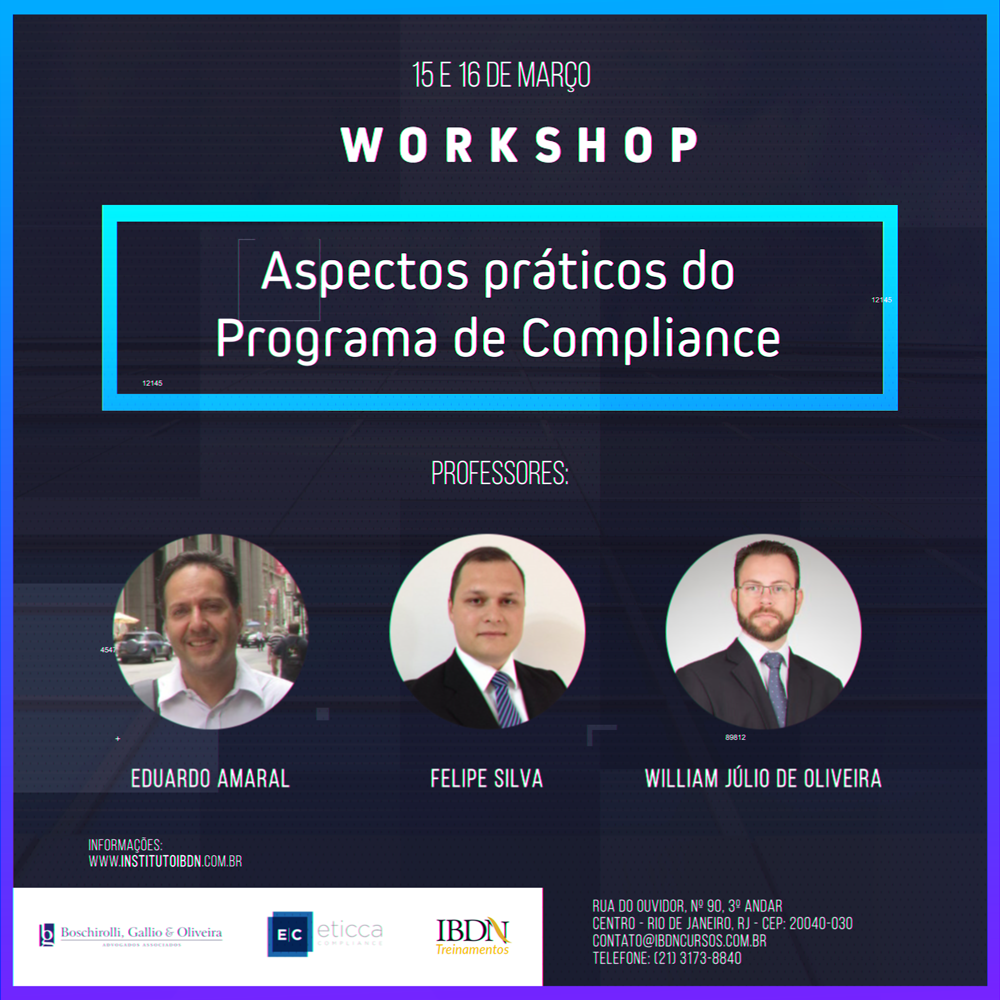 15 e 16 de março de 2018 – IBDN/RJ Nos dias 15 e 16 de março o IBDN, em parceria com Eticca Compliance e BGO Advogados, estará realizando em sua sede, o Workshop Aspectos Práticos do Programa de Compliance. Se você é empresário ou atua na área de Compliance; é gestor de escritório de advocacia […]